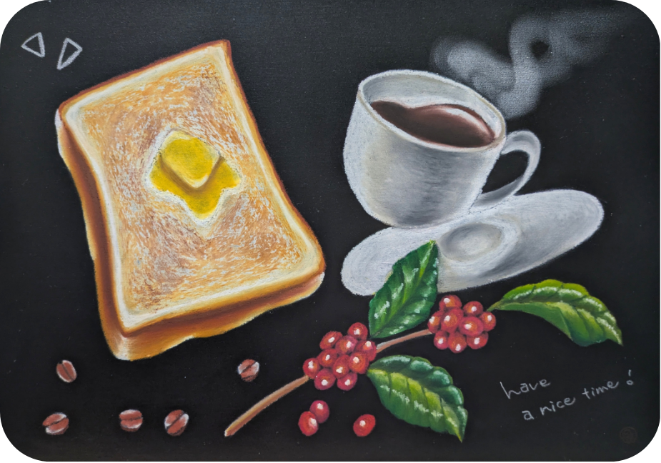 チョークアーティストとして10年以上活動し、指で描くオイルパステルならではの温もりと立体感を大切にした作品を制作。